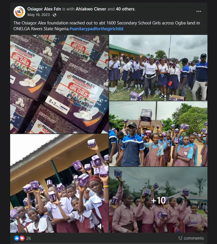 The Osiagor Alex Foundation recently reached out to 1,600 secondary school girls across Ogba Land in ONELGA, Rivers State, providing them with sanitary pads.
